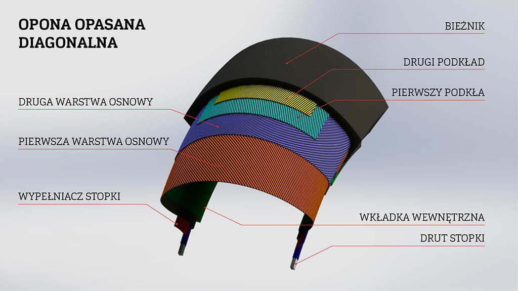 Opony diagonalne mają najdłuższą tradycję i są najbardziej rozpowszechnione na rynku. Karkas opony diagonalnej składa się z dwóch lub więcej warstw kordu tekstylnego (rayon, nylon, poliester), które są skrzyżowane pod pewnymi kątami. Opony diagonalne są właściwym wyborem dla mniejszych motocykli o mniejszej pojemności, skuterów i starszych motocykli, których podwozie jest przystosowane do opon diagonalnych.