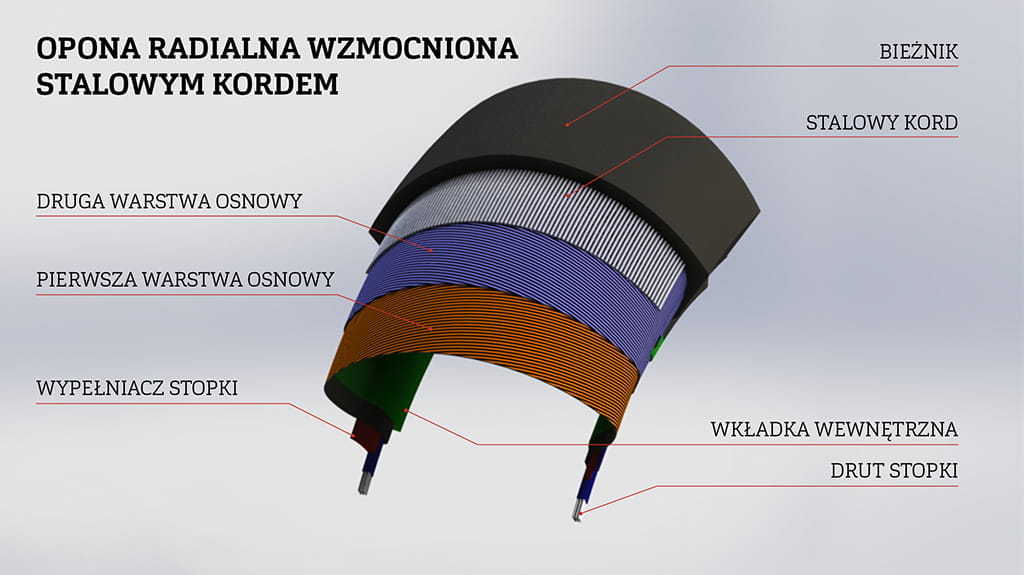 Opony radialne wzmocnione kordem stalowym mają dodatkowy kord stalowy umieszczony pod powierzchnią bieżnika. Efektem końcowym jest bardziej sztywna osnowa, która zapewnia optymalne osiągi podczas jazdy w miarę zużywania się opony, a także przez cały okres jej eksploatacji.