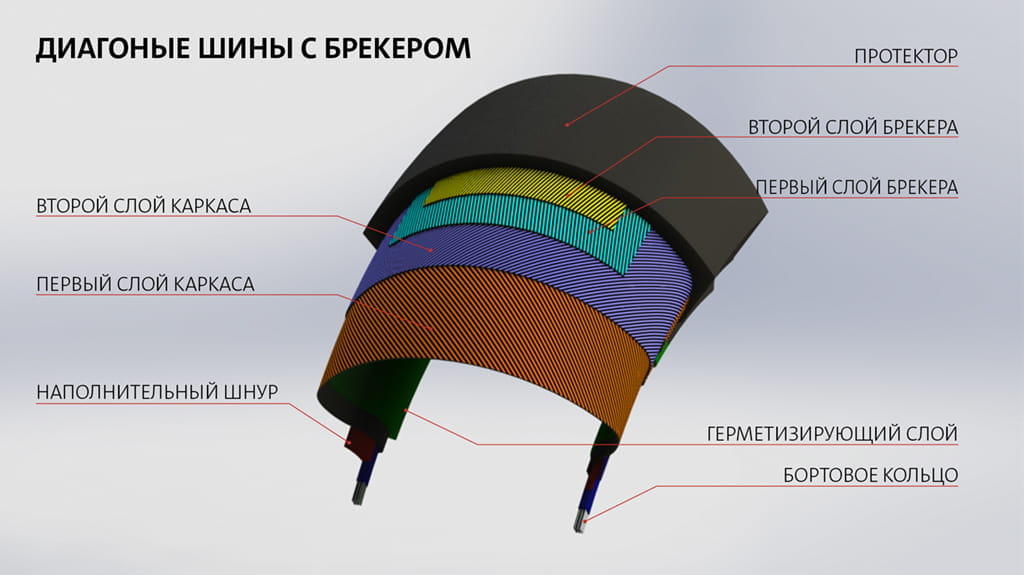 Шины с диагональным кордом – имеют самую давнюю технологию и наибольшее распространение на рынке. Каркас шины с диагональным кордом состоит из двух или более слоев текстильного корда (вискоза, нейлон, полиэстер), которые пересекаются под определенными углами. Шины с диагональным кордом – правильный выбор для небольших мотоциклов с меньшим объёмом двигателя, мотороллеров и старых мотоциклов, шасси которых адаптировано к шинам с диагональным кордом.